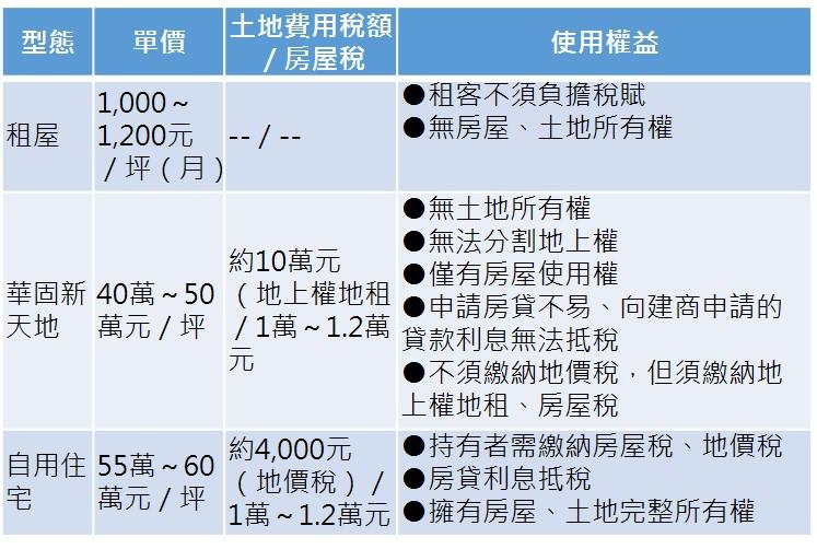 註:住宅單價為華固新天地景美周邊售價;地價稅、地租地坪估算每戶土地坪數約11坪,2016年該地公告現值為每平方公尺68,900元,房屋稅計算坪數為每戶45坪。 資料來源:台灣房屋智庫